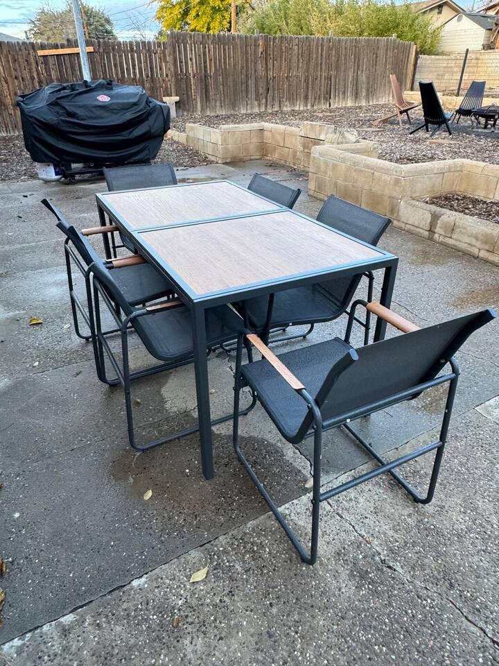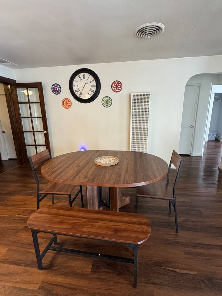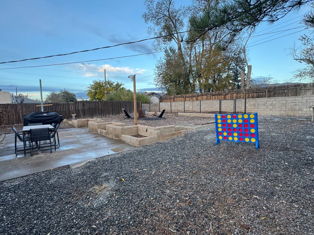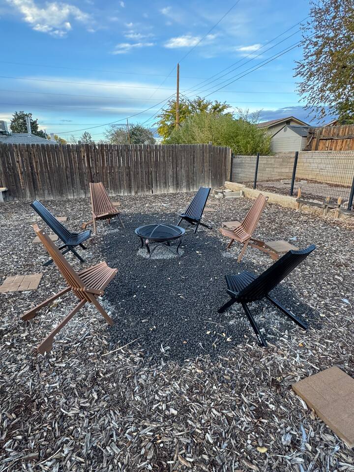 House Features: • WiFi • Washer/Dryer • Swap cooler for summer season, Central heat for winter • Games for kids and adults KITCHEN: • Appliances ( blender and toaster) • Dishes / silverware/ glasses / coffee mugs / cookware • Drip coffee maker • Dinning tablet for 6 LIVING-ROOM • Smart TV ( Hulu, Netflix, Prime and more app that you can open your account on) SLEEPING • Bedroom #1 has KING bed • Bedroom #2 has QUEEN bed • Living room has QUEEN sofa bed BATHROOM • Fresh clean towels • shampoo/conditioner/body-wash/lotion • Hairdryer • Q-tips / cotton balls OUTDOORS • Grill gas and charcoal • Dinning tablet for 6 • Fire-pit area * The only lighting in the back yard is a motion sensor solar light. There are a lot of cats in the area, and the light tends to go on and off pretty often during the night because of them. CAMERA • cameras are located one in the front of the house on the right side of the front door and the other is on the right side of the house going to the backyard. This is for the safety of our guest. Evaporating Cooler/ Swap cooler is seasonal, they work during summer months only when temperatures are not freezing.